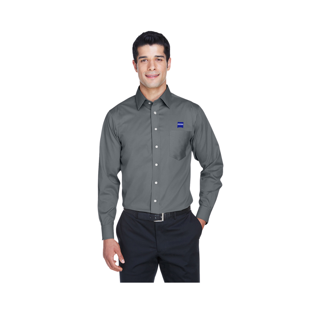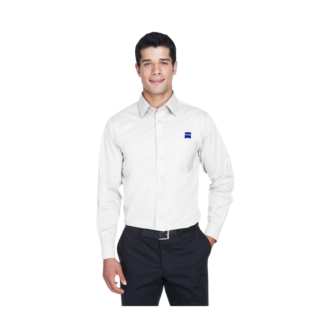 3.5 oz., 53% cotton, 43% polyester, 4% lycra. Easy care, active fit. Adjustable comfort collar for up to an inch of stretch at neck. Blue and White embroidered ZEISS logo.