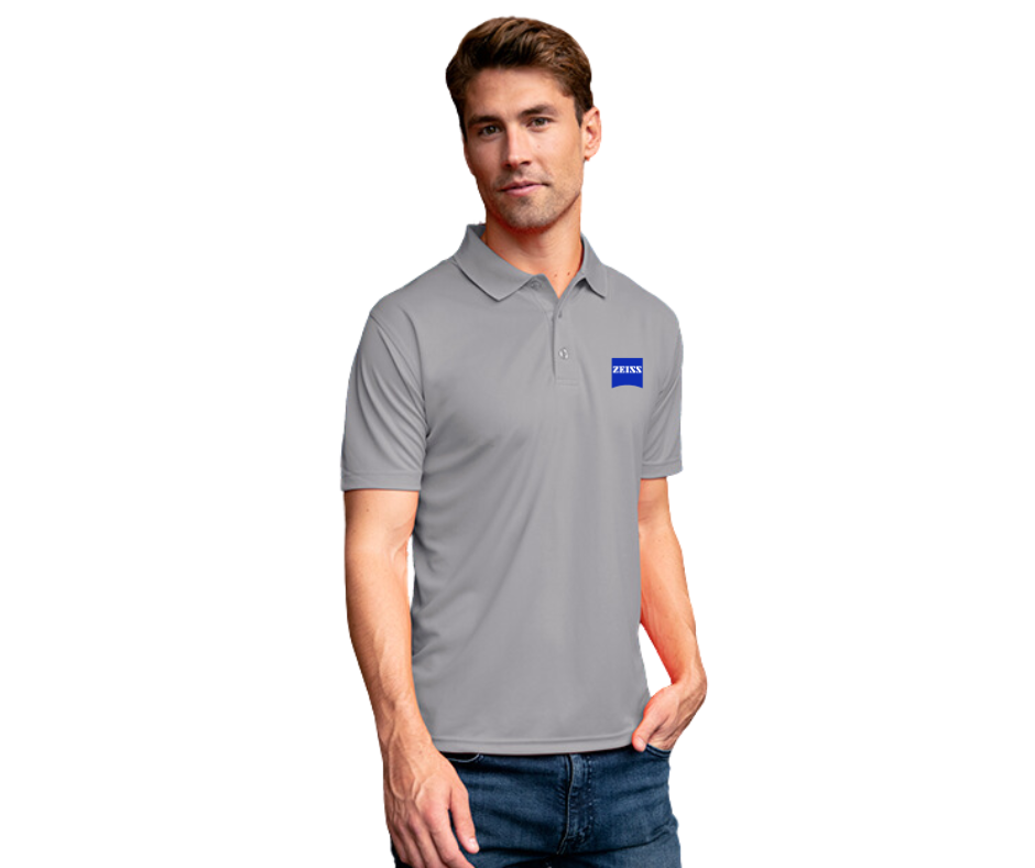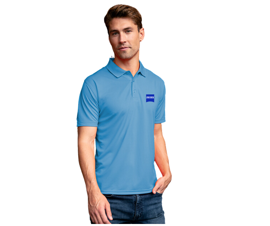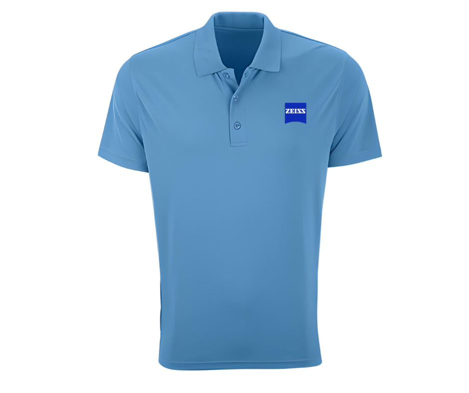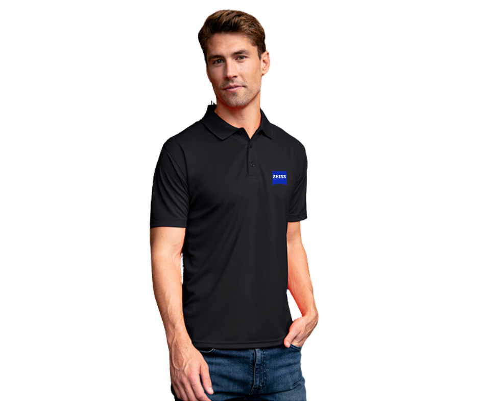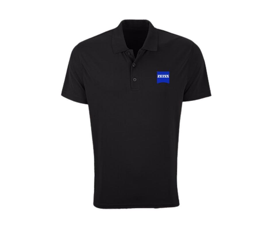 Moisture wicking with UV protection golf shirt keeps you cool and comfortable. Fabric is specially engineered to resist snags and pulls with a lighter smoother hand then other polos. No curl rib knit collar, 100% polyester, , 4 1/2 oz. Offered in black with ZEISS rubber patch on right sleeve.