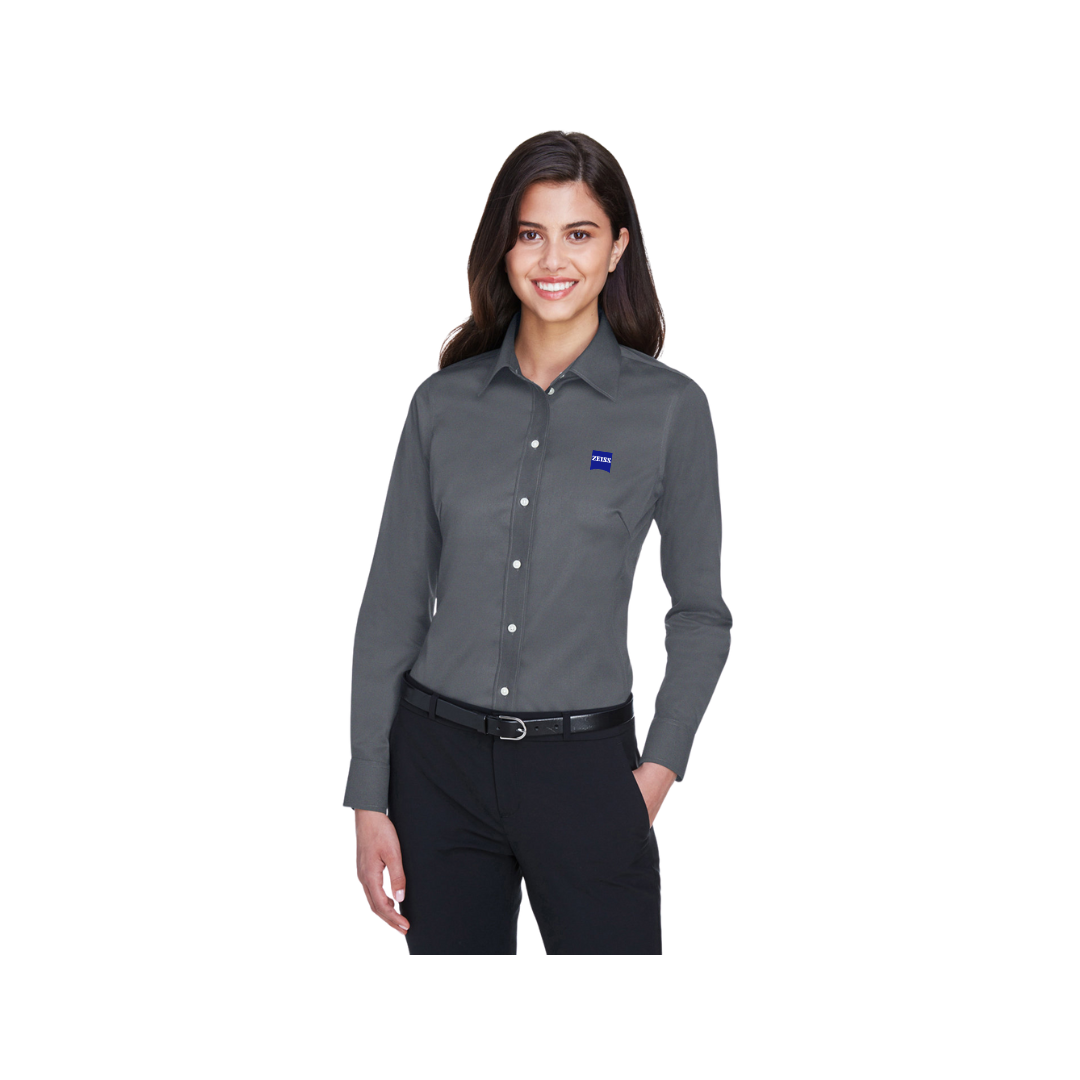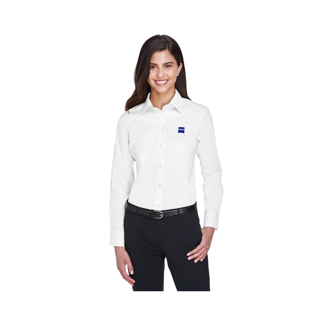 3.5 oz., 53% cotton, 43% polyester, 4% lycra. Easy care, active fit. Front and back princess seams for flattering feminine fit. Blue and White embroidered ZEISS logo.