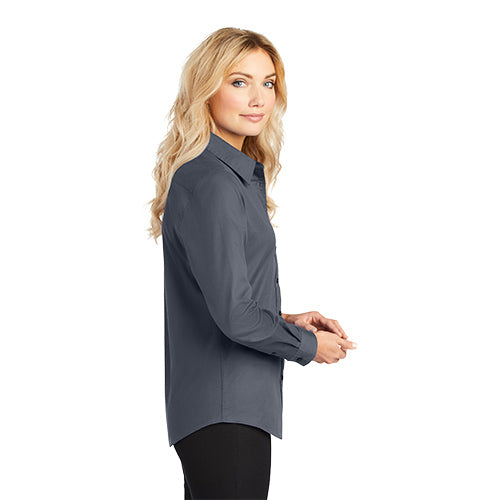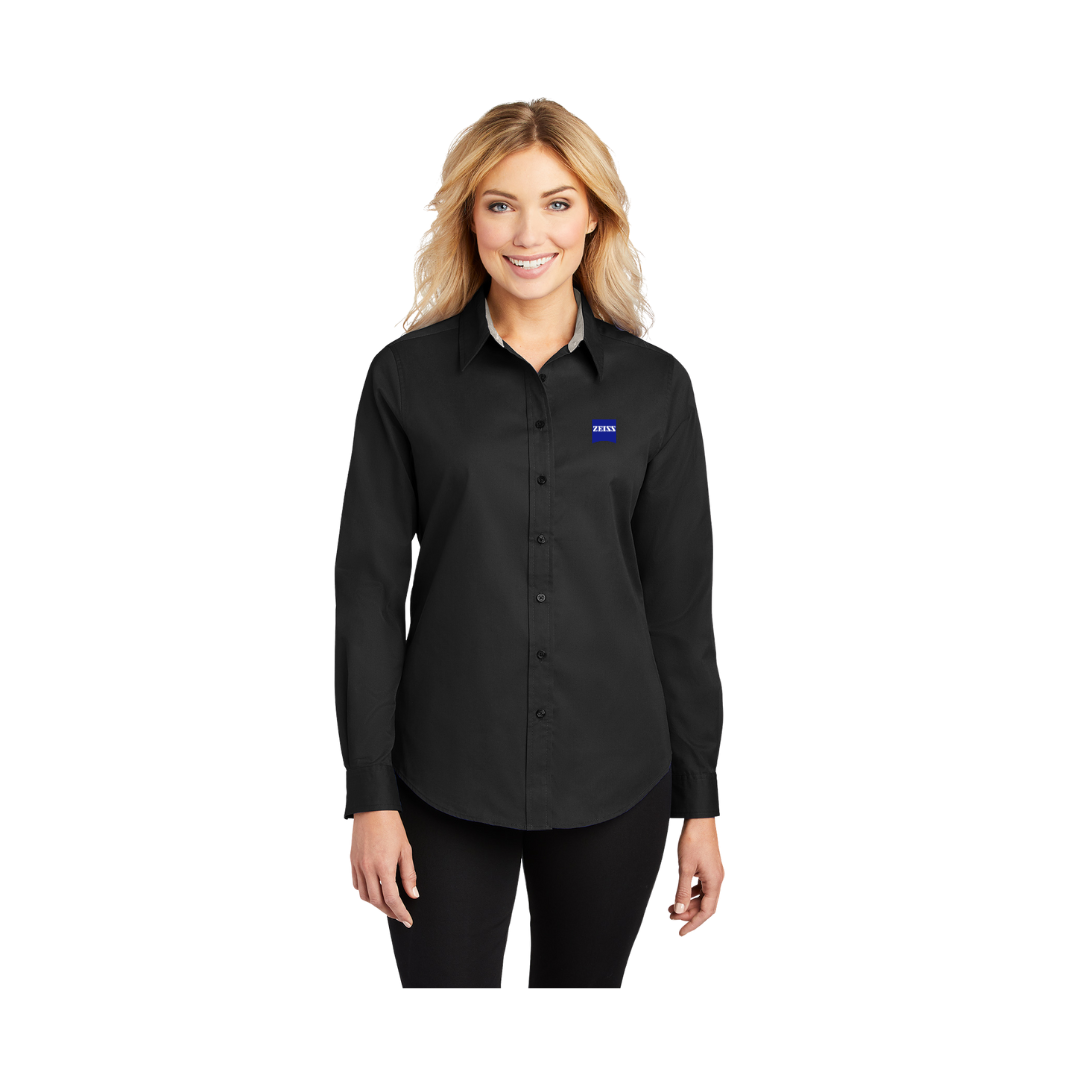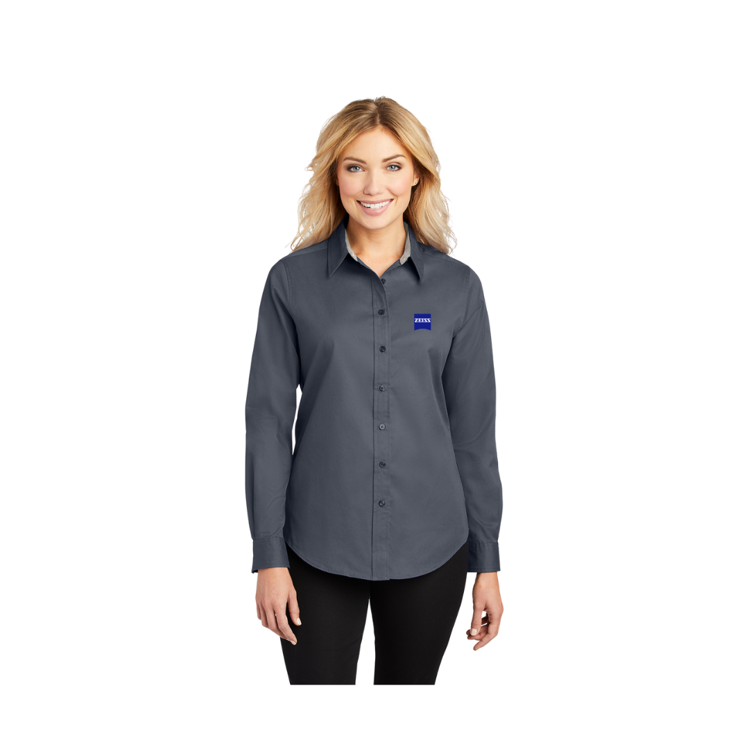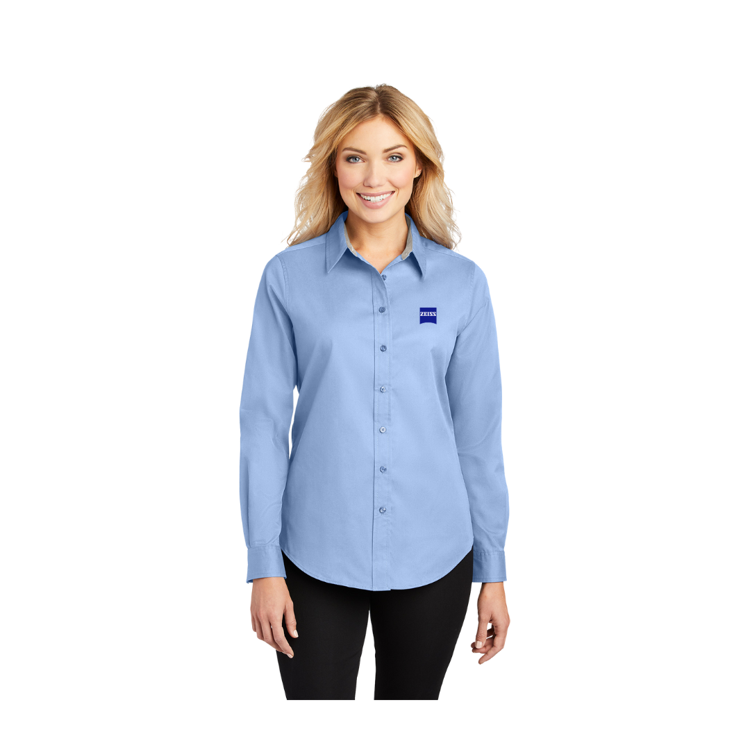 Comfortable wash and wear easy care shirt. Wrinkle resistant, open collar and dyed to match buttons. Blue and White embroidered ZEISS logo.